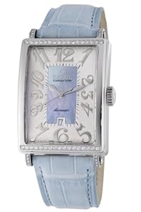 A silver dial frames a centerpiece of blue mother-of-pearl, and it also includes a three-handed movement and date window above 6 o'clock. It's completed by a supple crocodile leather strap in light blue with tonal stitching accents. Other features include a 25-jeweled automatic movement with a 40-hour power reserve, curved sapphire crystal for excellent scratch resistance, and water resistance to 50 meters (165 feet)--suitable for swimming but not for diving.
