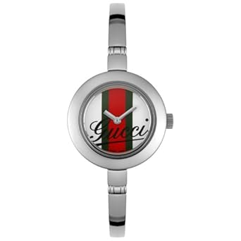 Stainless steel case with a hinged stainless steel bangle bracelet. Fixed stainless steel bezel. Red and green striped dial with silver-tone hands. No markers. The Gucci name appears center dial in oversized script. Dial Type: Analog. Quartz movement. Scratch resistant sapphire crystal. Solid case back. Case diameter: 25 mm. Round case shape. Band length: 6.5 inches. Jewelry clasp. Water resistant at 30 meters / 100 feet. Functions: hour, minute. Casual watch style. Gucci 105 Series Striped Dial 6.5" Bangle Ladies Watch YA105518.