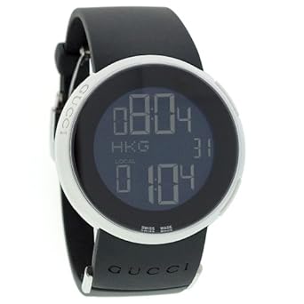 With its mix of black and silver tones, bold design, and precise craftsmanship, the GUCCI Women's i-gucci Digital Black Watch #YA114401 is a luxurious piece you'll love to show off. A generously sized, silver-tone stainless steel case surrounds a sleek digital dial, complete with easy-to-read time display. For flexible comfort, a black rubber strap closes easily with a deployment push-button clasp with buckle, while both a scratch-resistant sapphire and water resistance to 99 feet (30 meters) provide an extra measure of protection against wear and tear. As reliable as it is stunning, this Gucci original boasts the accuracy of Swiss quartz movement.