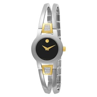 The elegant simplicity of Movado's signature Museum dial is highlighted in this sleek and versatile timepiece from Movado's Amorosa series. This two-tone watch features a round black dial with gold-tone Dauphine hands and a concave dot marker at the twelve o'clock position. This is the minimalist look made famous for Movado by American designer Nathan George Horwitt in 1947. Horwitt intended his design to be evocative of a sun dial, with the dot representing the sun at high noon. The dial is housed in a 24 mm steel case and framed by a perfectly round silver-tone bezel. The watch presents on a beautiful silver-tone polished steel bangle bracelet accented with gold-tone links that hold 18 small round diamonds. The bracelet fastens with a jewelry clasp. Other notable features include a scratch-resistant sapphire crystal and precise Swiss quartz movement. Water-resistant to 30 meters, this watch can withstand splashes and brief immersion in water; however, it is not sufficiently resistant for swimming.