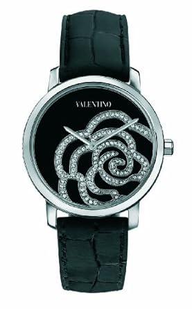 This valentino iconic stainless steel time piece is the protagonist. Delicately decorated on the black dial, is a dévoré velvet inlay effect, "embroidered" with diamonds. This watch sports a refined looking black crocodile leather band, closing with a fold over clasp with safety button.