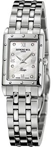 Stainless steel case with a stainless steel link bracelet. Fixed bezel. Mother of pearl dial with luminous hands and 8 diamond hour markers. Roman numerals mark the 3, 6, 9, and 12 o'clock position. Quartz movement. Scratch resistant sapphire crystal. Case diameter: 23 mm x 18.5 mm. Deployment clasp. Water resistant at 50 meters/ 165 feet. Functions: hours, minutes. Raymond Weil Tango Mother of Pearl Diamond Dial Ladies Watch 5971-ST-00995.